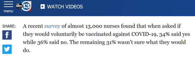 但多项调查却显示,在美国防疫一线的护士群体中,多数人对接种疫苗存怀疑乃至抵触态度。在近1.3万名受访护士中,仅有34%的护士愿意接受新冠疫苗,而不愿意打疫苗和还在犹豫的人群则分别占了36%和31%。