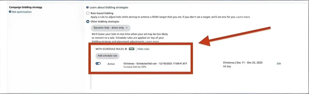 从12月11日到25日整个圣诞旺季,在亚马逊广告后台的特定设置选项里,系统默认激活了“全天自动加价50%”的规则;