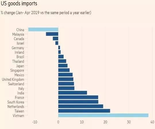 英国《金融时报》对美国国际贸易委员会(United States International Trade Commission)数据进行分析后发现,今年前四个月,美国从越南的进口额比去年同期增长了近40%。这是美国前40大进口来源国中增幅最大的。