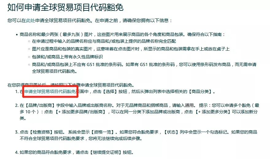 b.找到“如何申请全球贸易项目代码豁免”,然后点击“申请全球贸易项目代码豁免”,,进入申请豁免页面;