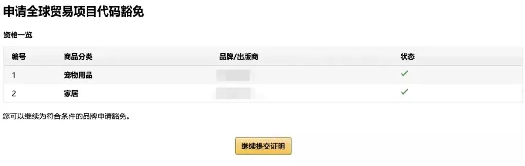 3、点击“检查资格”,符合豁免条件的会在“状态”栏下打钩,若不符合,则显示该品牌需要批注。