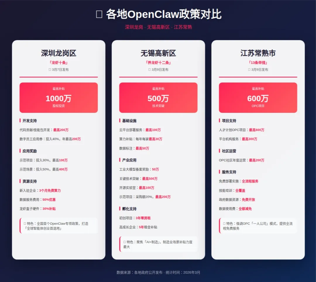 据初海视野了解,3月7日,深圳市龙岗区正式出台推出"龙虾十条"的重磅政策,覆盖平台支持、数据使用、资金补贴、人才支持、资本赋能、出海服务、品牌活动等多个方面,鼓励和支持企业接入和应用OpenClaw,比如对购买数据治理、标注等服务用于OpenClaw开发的企业,按费用给予50%补贴;对购买即插即用的“龙虾盒子”(AI NAS)硬件,按市场价30%给予补贴等等。