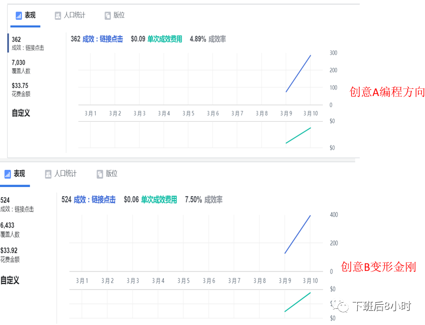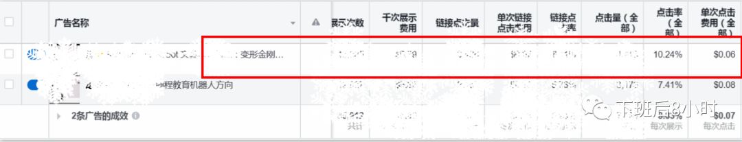 小编以做过的不同文案创意做对比,一组文案是变形金刚,一组文案是编程方向,可以很明显的看出变形金刚的文案创意表现远远优于另一组,这样在后续的投放的时候文案就向着变形金刚这个主题,同时TA的受众也可以更偏向变形金刚边为主。
