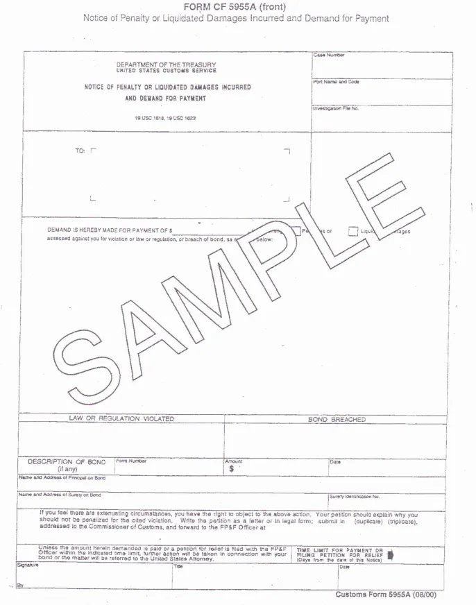 保证金违约罚金会通过《罚款或保证金违约罚金通知及付款要求》(Notice of Penalty or Liquidated Damages Incurred and Demand for Payment)(CBP 表格 5955A)(CBP Form 5955A)发出。