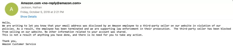 亚马逊对于客户隐私信息一直都是非常看重的,早在之前,亚马逊就封了一批因疑似泄露买家信息的卖家账号。据外媒报道,在上周五,亚马逊又炒掉了一名向第三方卖家透露客户电子邮件地址的员工。亚马逊表示,涉事员工只收到了电子邮件地址,但不包括任何其它客户信息。即便如此,该公司还是向所有受影响的客户发去了有关此事的通知。目前,亚马逊没有公布受影响的确切客户人数,也拒绝提供有关涉事员工的其它信息。