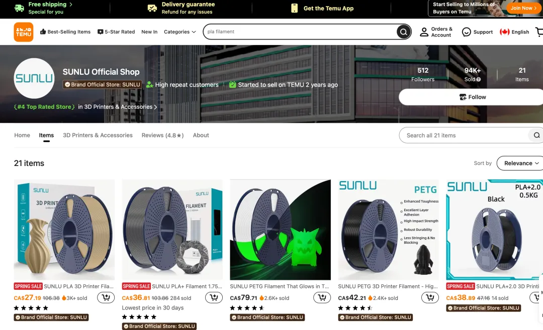 线上平台(基本盘):Amazon是SUNLU的主阵地,长期在3D打印耗材(3D Printing Materials)及3D笔类目占据Best Seller席位 。