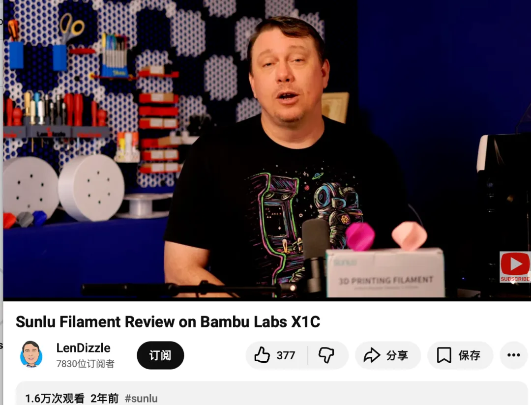 @LenDizzle:该YouTube博主粉丝量约7.8千,属于高转化率的尾部精准KOC。虽然粉丝绝对值不大,但受众极其聚焦,主要面向拥有Bambu Labs等高端高速3D打印机设备的高净值极客玩家。