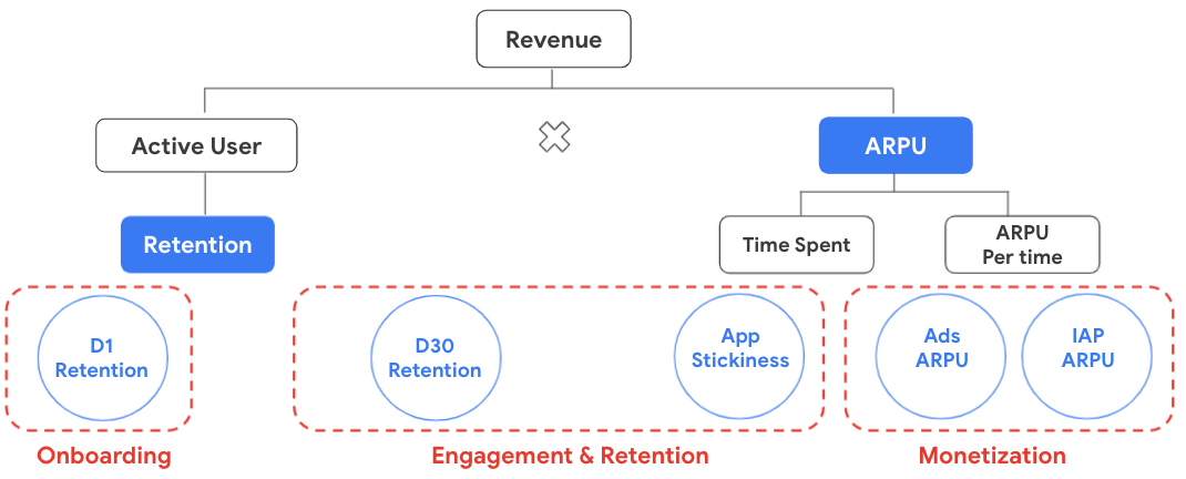 首先单看活跃用户的数量,在用户生命周期价值的区间内,开发者通常关注的是留存数据, 例如 30 日内的留存情况。接着看 ARPU,也就是每个用户平均贡献的收入价值。这个数值需要考虑单个用户在应用内的花费时长和收益变现。当然,越多高价值的用户自然收益越高。除此之外,开发者也可以在优化留存和用户花费时长,对产品的黏度等多方面做长期不懈地优化迭代。这正是本期文章的解读重点。
