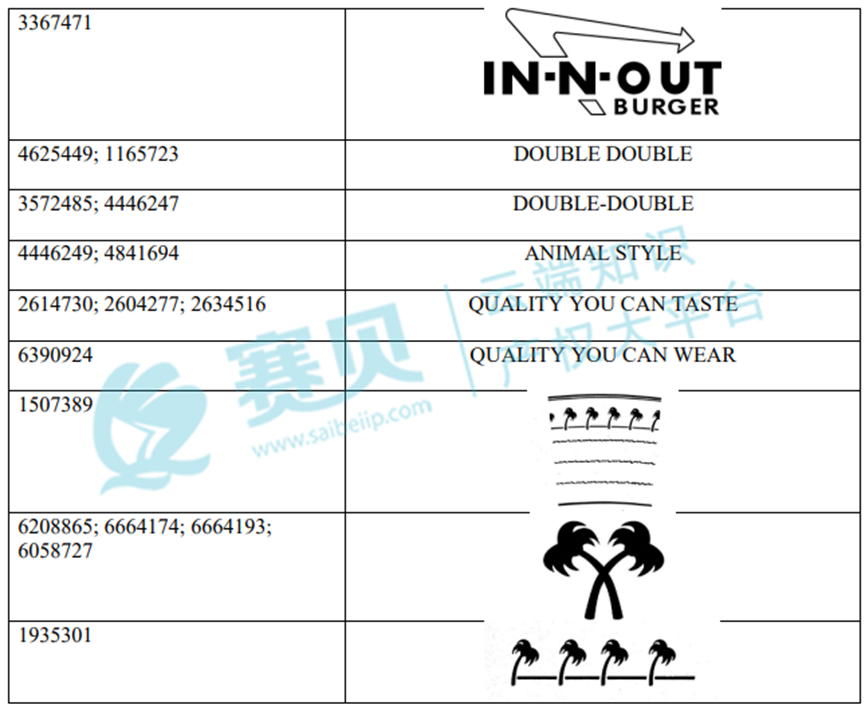In-N-Out Burgers 拥有大量商标,包括文字商标 “IN-N-OUT”“DOUBLE DOUBLE”“ANIMAL STYLE”“QUALITY YOU CAN TASTE”“QUALITY YOU CAN WEAR” 等,以及包含图形元素(如棕榈树、交叉棕榈树、带有箭头的特定设计等)的商标。这些商标在多个类别进行了注册,涵盖餐饮服务(如餐厅服务、外卖餐厅服务)、食品饮料(如汉堡、薯条、奶昔、软饮等)、零售与邮购服务、服装及周边产品(如衬衫、帽子、背包等)、计算机服务(如提供数据库服务)、金融赞助和慈善筹款服务等多个领域。,未经授权使用In-N-Out Burgers相关的文字图形商标,均属于侵权行为。