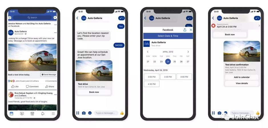 Appointment Booking功能则是通过Messenger的API可以和日历集成,这样方便用户在聊天窗口中直接选择时段来实现预订功能。