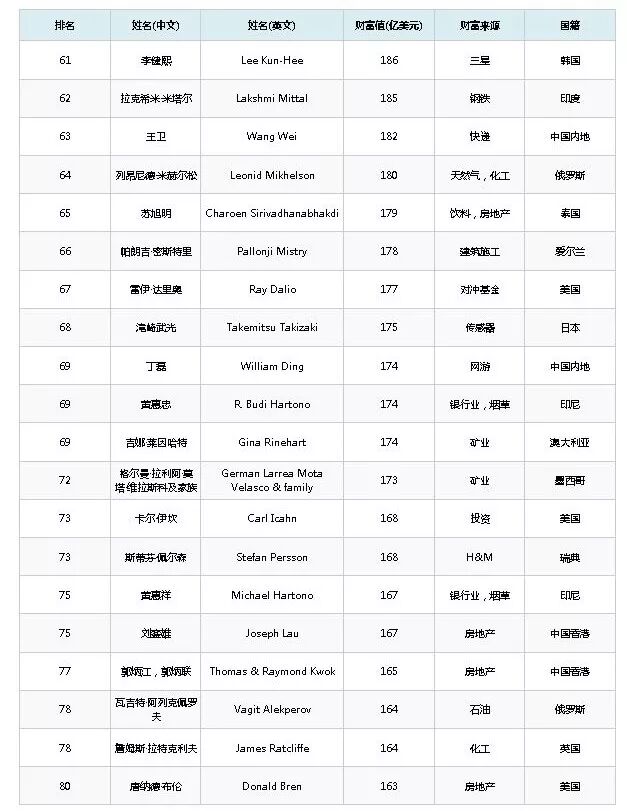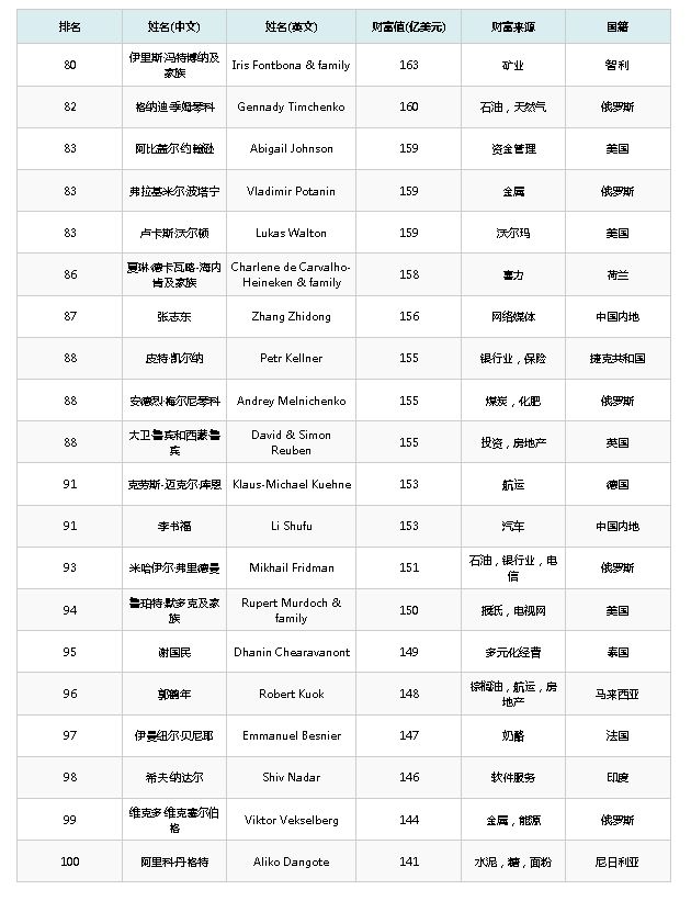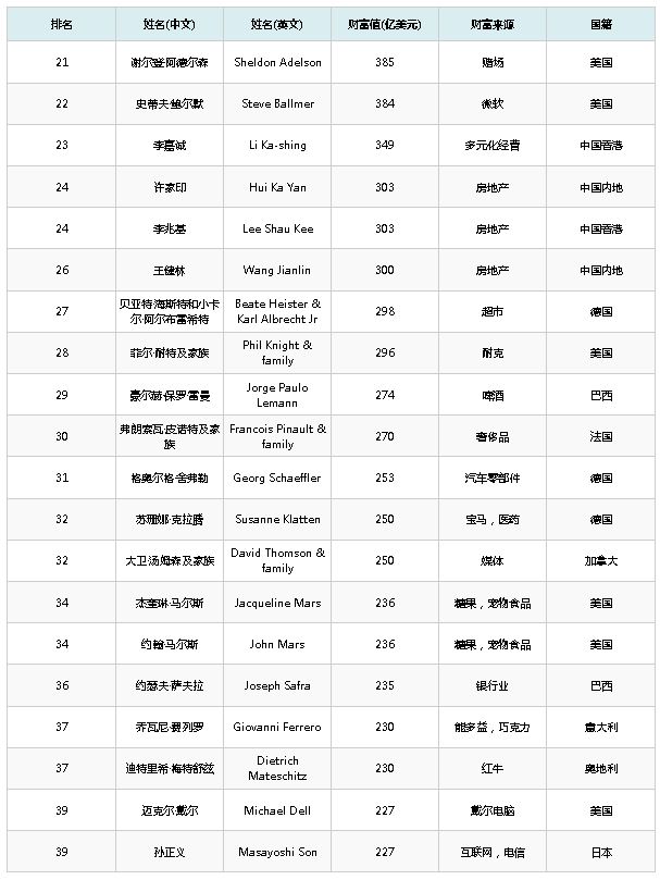 李嘉诚、许家印、李兆基、王健林等依次排名第23位、24位、25位和26位。新浪财经特别推出《2018福布斯全球亿万富豪榜》强大搜索版本,支持姓、名、企业、行业等多种查询方式。