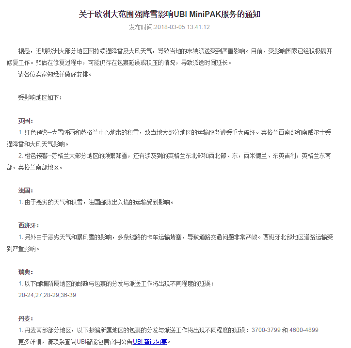 欧洲多国物流延误,eBay发布UBI MiniPAK服务受影响通知
