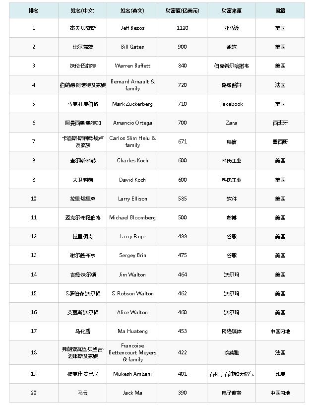 亚马逊创始人杰夫-贝索斯第一次成为首富,他的财富达到1120亿美元。马化腾以453亿美元成为全球华人首富,在全球富豪榜中排第17位,其次是马云,他以390亿美元在全球富豪榜中排第20位。