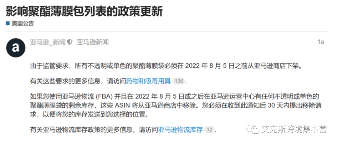 就在昨日,亚马逊新闻网发布一条新闻:亚马逊将于2022年8月5日或之后再亚马逊运营中心有任何不透明或者单色的聚酯薄膜袋都将被亚马逊移除。