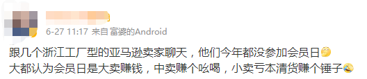 “跟几个浙江工厂型的亚马逊卖家聊天,他们今年都没参加会员日。大都认为会员日是大卖赚钱,中卖赚个吆喝,小卖亏本清货赚个锤子”。
