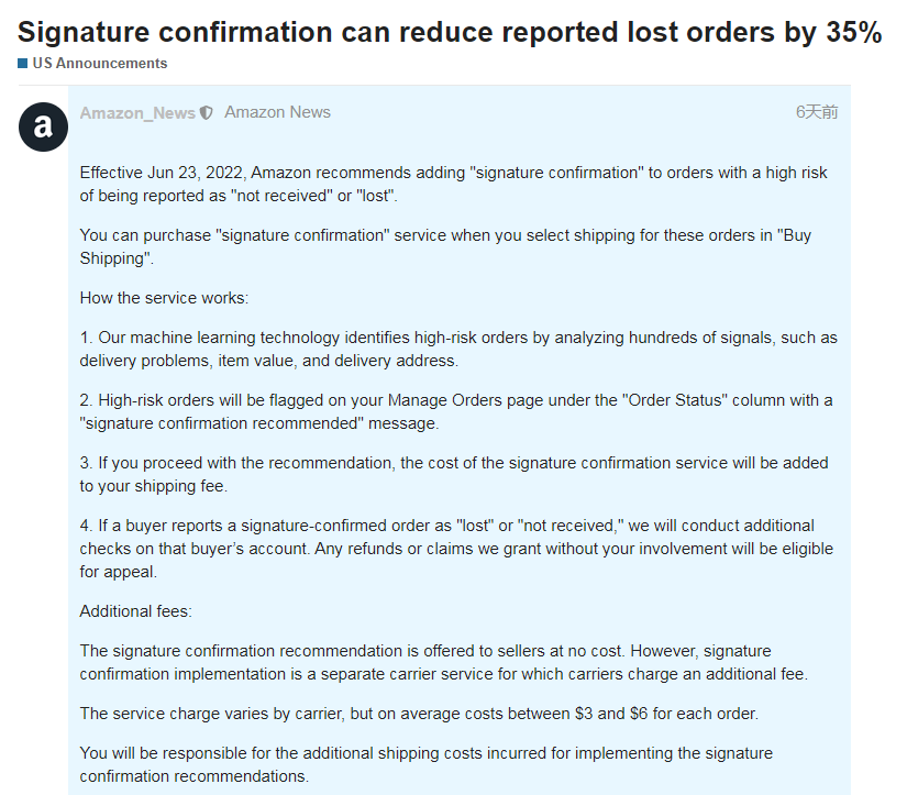 亚马逊建议使用“签名确认”服务, 这类卖家被拒之门外?