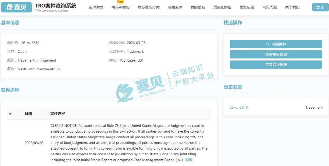 从赛贝TRO案件查询系统获悉,在美国联邦地区法院发起商标侵权诉讼,商标TRO案件,原告委托YoungZeal LLP律所维权,指控34家跨境电商店铺未经授权,销售带有其“NextClimb”注册商标的非金属通风口盖板类产品,涉及HVAC管道非金属通风口盖板、屋顶平台突起物/排水管/排水盆用非金属通风口盖板两大核心类目,涉嫌商标伪造、侵权及不正当竞争。