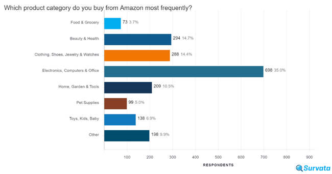 在“ 2019年亚马逊消费者购物研究 ”中显示,最受欢迎的类别包括“电子产品,计算机和办公用品”(35%),其次是“美容与健康”(14.7%),以及“服装、鞋类、珠宝和手表”(14.4%)。