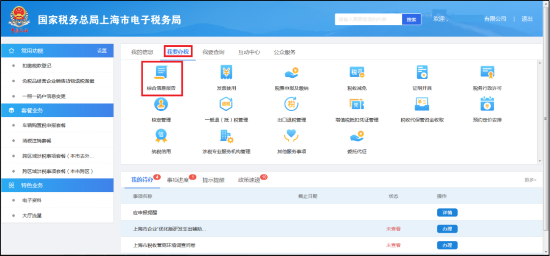 纳税人登录电子税务局,点击菜单栏“我要办税”中的“综合信息报告”模块,弹出页面左侧点击“资格信息报告”,右侧选择“出口退(免)税备案管理”,点击即进入办理页面。