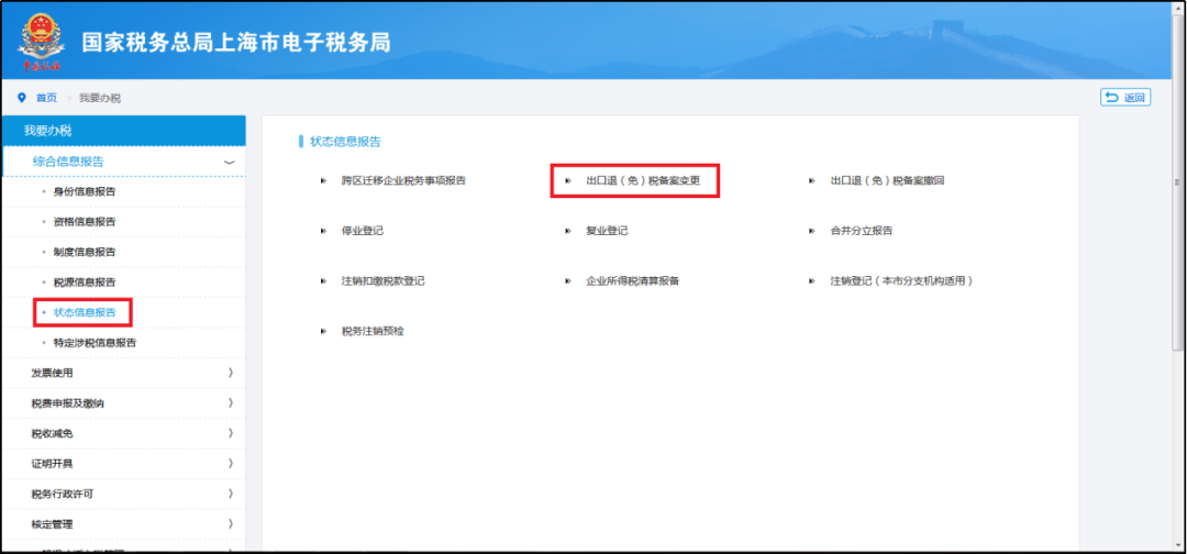 电子税务局——我要办税——综合信息报告——资格信息报告——出口退(免)税备案管理
