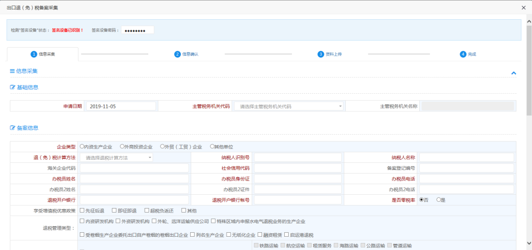 在信息采集页面采集数据,其中退税开户银行及退税开户银行账号系统会自动带出,若带出内容为空,企业需手动采集,当数据采集完成后,点击【下一步】按钮,进入信息确认页面,信息确认页面显示采集后的数据,数据只可查看不可修改。