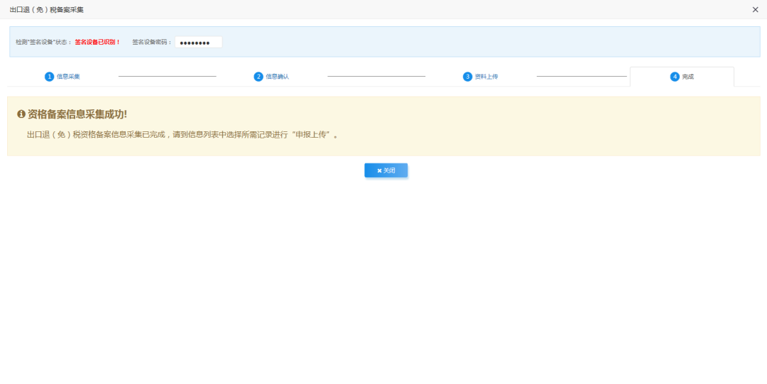 资料上传完成后,点击【下一步】按钮,进入完成页面。系统自动生成一条出口退(免)税备案申报数据,并且在办理页面显示该条申报数据。