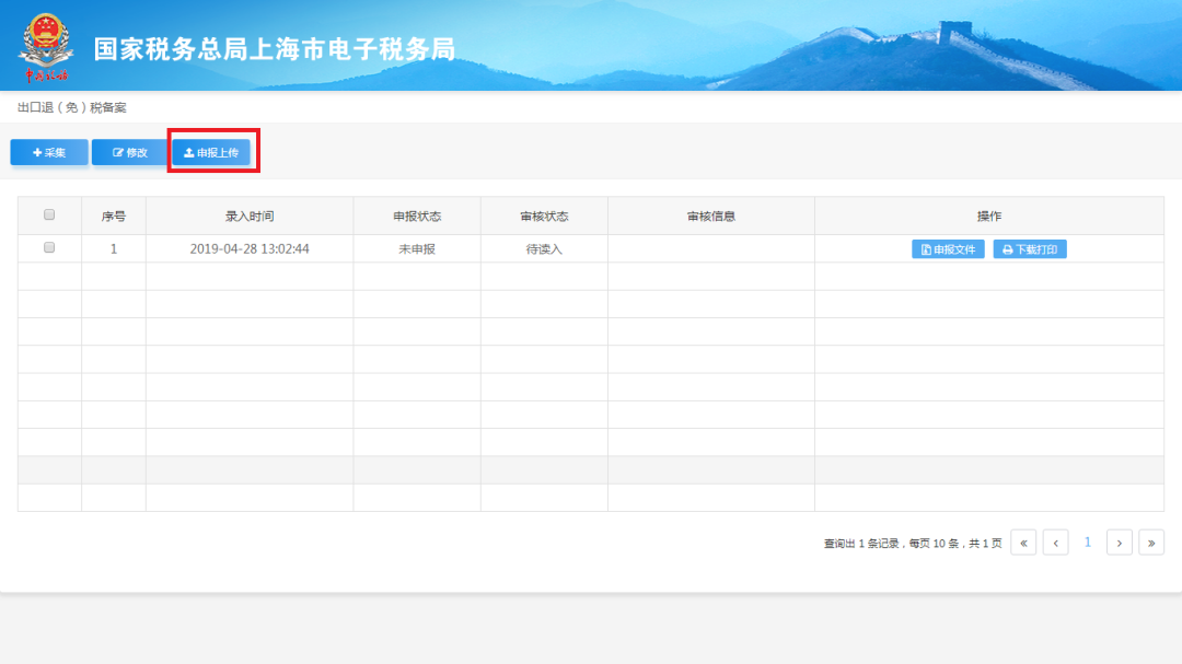 首先进入出口退(免)税备案数据采集页面,办理页面功能按钮包括:采集、修改、申报上传。