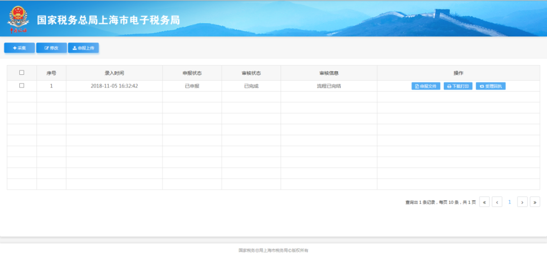 数据成功申报后,税务机关需要一段时间对数据进行审核,当审核完成后,则可进行后续文书下载等操作。
