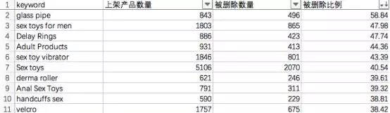 就像我这里利用大数据,就特别轻易能得到这一年时间里,被删几率高的关键词都有哪些,像这种被删比例有30%-50%多的,我是怎么也不会碰一下的,这样就极大避免我去选择一些危险系数高的产品。