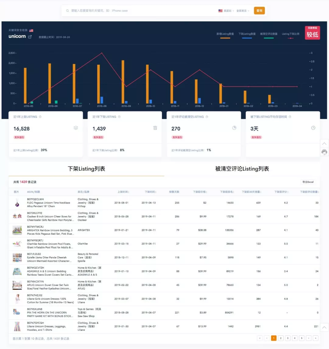只需输入你产品的核心关键词,就能分析这个关键词市场存有多大风险,比如:有多少Listing被删,被删的时间点以及各时间点的频率等等……也可以把这些被删Listing全部下载导出进行分析,给各位老铁用于评估市场风险。