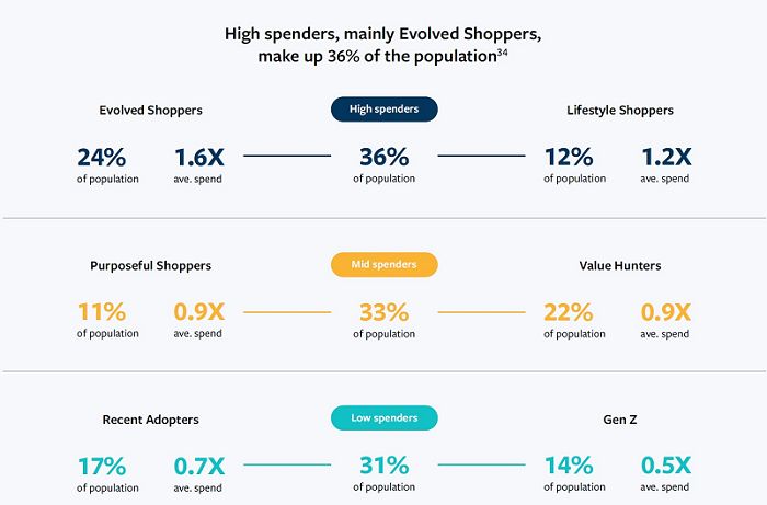 这已经打破了关于数字消费者的先入之见的神话:价值猎人是低消费人群,占在线购物者的大部分。取而代之的是,“价值猎人”仅次于人口最多的“进化的购物者”。