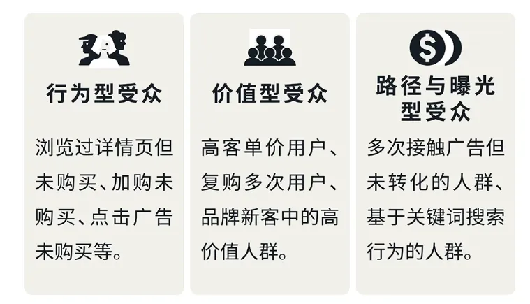 比如你会发现,很多用户可能是先看了你的品牌广告,后来才通过商品广告点击,最后被展示广告拉回来完成购买——这样你就知道,不能只盯着最后那个点击的广告,帮你基于行为、价值和转化阶段精细划分受众。
