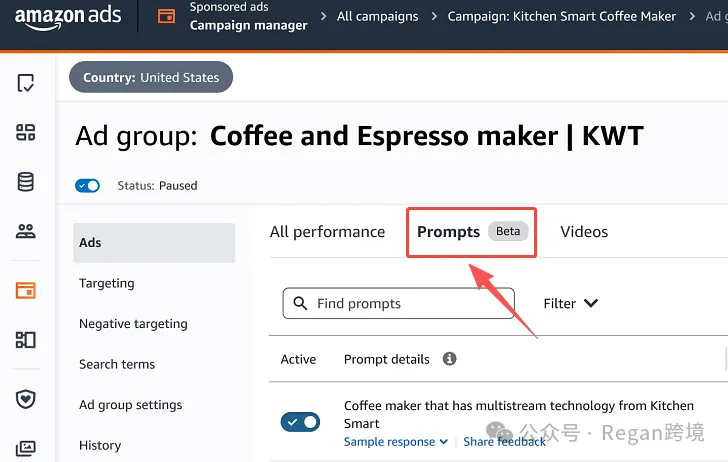 可在广告后台广告活动管理器→广告活动→广告组→广告→提示词(Prompts)中查看: