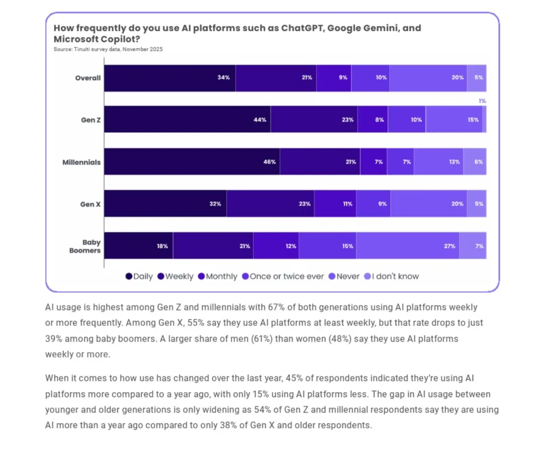 2025年11月,针对1037名美国成年人开展的调研显示,AI已从尝鲜工具演变为日常基础设施。34%的受访者每日使用AI平台,另有21%每周使用,仅20%从未使用。45%的用户较一年前使用频率提升,仅15%减少。代际差距显著,67%的Z世代与千禧一代每周至少使用一次,而婴儿潮一代仅39%。男性周频使用率为61%,高于女性的48%。这一结构表明,AI渗透已跨越早期采用者阶段,进入主流扩张通道。