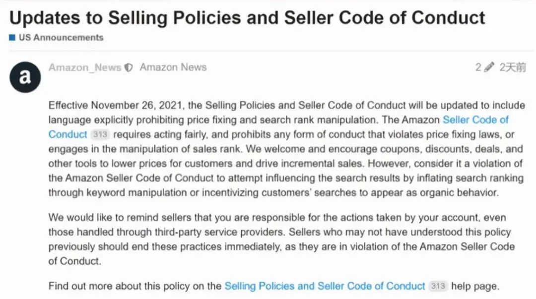 自 2021 年 11 月 26 日起,销售政策和卖家行为准则将进行更新,将包含明确禁止任何形式的违反价格垄断法律或操纵销售排名的行为。