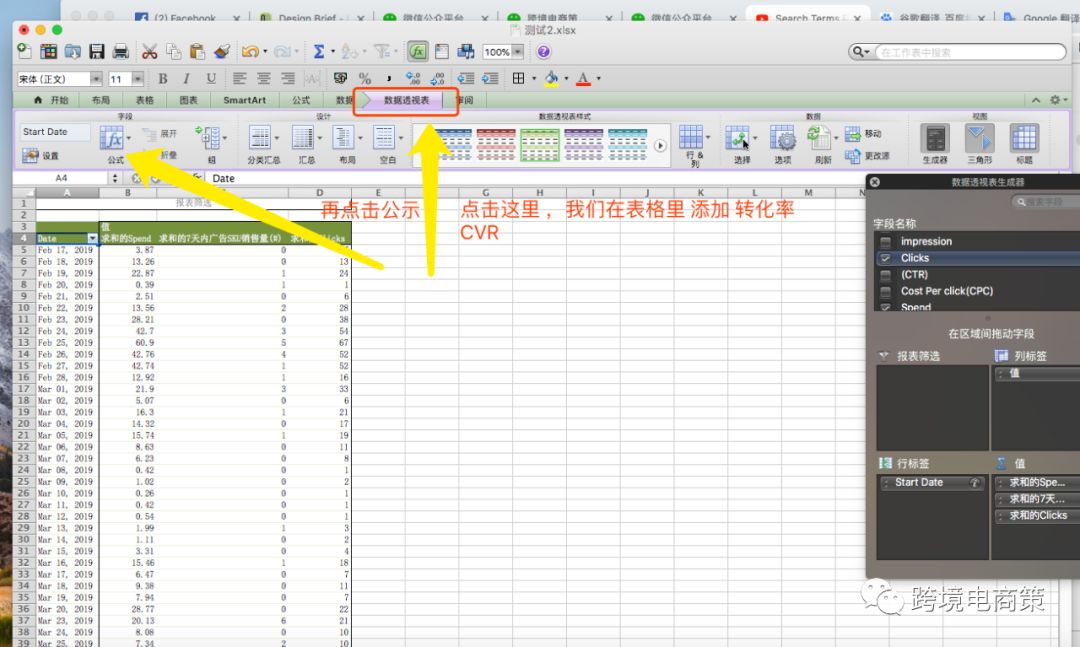 在这个表格里你非常清楚的看到,每个关键词在某一个时间段的表现,带来的转化,你还可以把ACOS还有其他变量同时加进去,可以观察你的关键词在某个时间段花了多少钱 ,并且一共带来的点击量以及转化率是什么样的,你根据这个表可以更好的判断词的表现,这个简易数据透视表,其实告诉我们的信息是很多的,我们可以利用这种表格 更好的判断广告哪里出问题,并且下一步如何调整等等。
