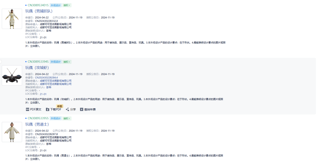 除此之外,电影中出现的大大小小的角色及标志性道具的三维动画、Q版图库及动作设计等多方面也申请了著作权及专利保护!形成立体化IP护城河。