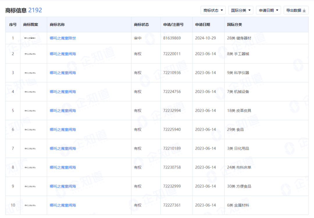 申请的商标涉及多个国际分类,“哪吒之魔童闹海”这一商标的申请范围包括教育娱乐、科学仪器、手工器械、方便食品、日化用品等多个类别。