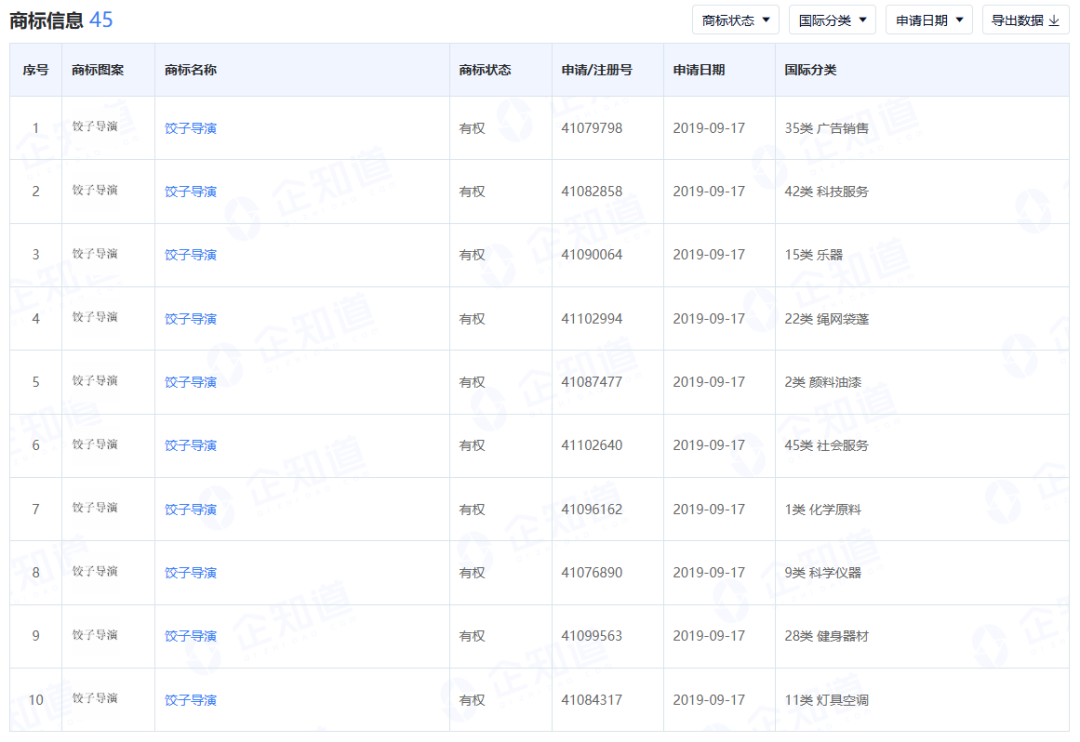 除了针对影片名称进行商标保护,出品方甚至对“饺子导演”也进行了商标的防御性全类别注册,避免被他人恶意抢注影响自己后续继续使用该艺名。