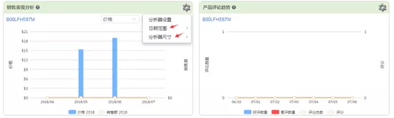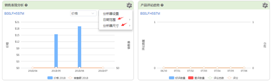 销售表现、产品评论趋势分析 销售表现分析:查看“广告监测产品列表”分析器中选中产品对应广告关键词的表现。 产品评论趋势:查看“监测产品列表”分析器中选中产品的评论趋势。 销售表现分析器与产品评论趋势分析器异同 同:两个分析器均为图表设置,点击齿轮按钮均有分析器设置、日期范围、分析器尺寸设置功能。 异:销售表现分析器能根据不同的指标条件的组合搭配进行智能分析。它的板块设置有显示年份(当年/两年数据)、显示指标(显示条件、图形模式、颜色设置)、指标管理(等同于监测产品列表的显示列)功能。 两个分析器的日期范围和分析器尺寸功能与监测产品列表的一样,请参考产品列表监测。