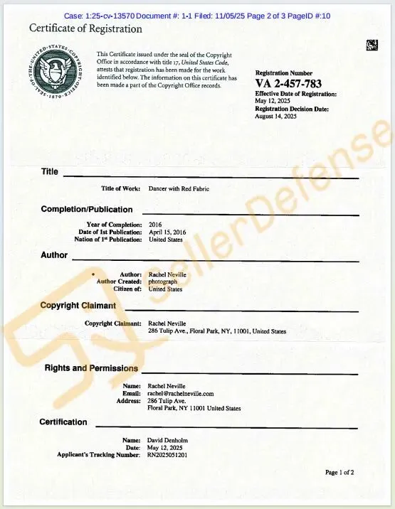 原告 Rachel Neville 是一位摄影师。原告为舞蹈团体和编辑出版物创作独特、震撼且具有变革性的视觉作品,旨在吸引观众的目光,激发他们的想象力,并将他们带入剧院。