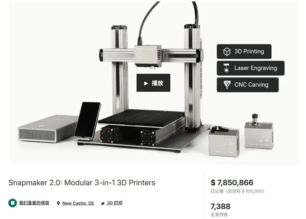 2019年是快造科技海外众筹的“关键转折点”。同年1月,公司获得同创伟业2000万元Pre-A轮融资,估值达1.6亿元;5月,新品Snapmaker 2.0登陆Kickstarter,发布七分钟即获得百万资金支持,最终筹得约785万美元 ,成为当时全球众筹史上金额最高的科技类项目。
