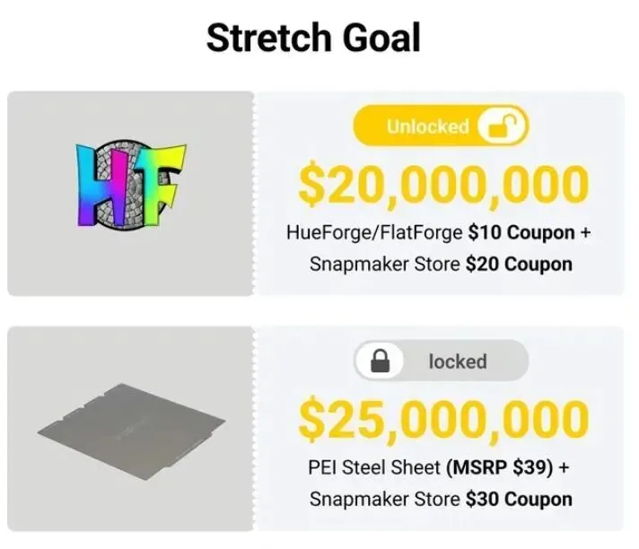 而在众筹金额突破2000万美元的里程碑后,Snapmaker进一步解锁延伸目标:为每位支持者追加HueForge的额外折扣券,以及Snapmaker Store的无门槛优惠券,既回馈了现有支持者,也刺激了后续订单转化。
