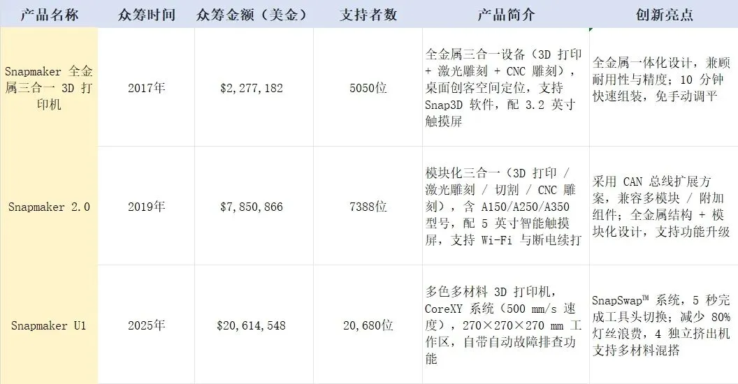 从227万到785万,再到如今的2061万,Snapmaker系列产品的众筹进阶之路,堪称一部中国科技品牌海外众筹的“实战教科书”。