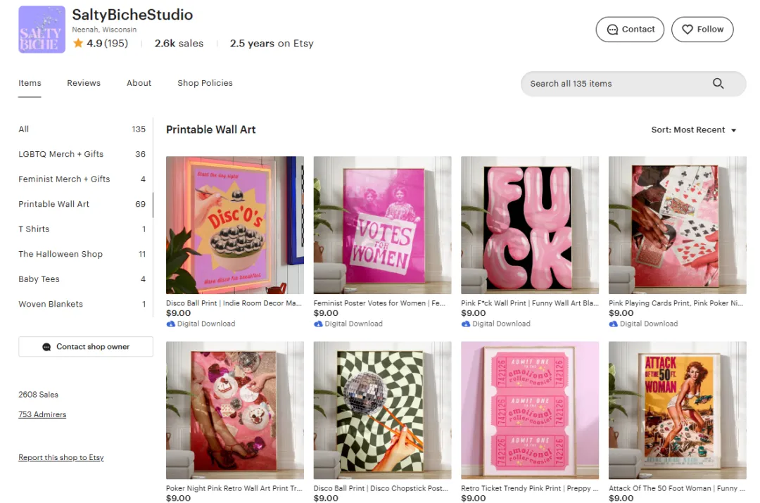 原告Caroline Valsaint是一位数字设计师兼视觉艺术家,其作品融合复古与前卫元素,将拼贴与波普艺术巧妙结合,打造出既俏皮又发人深省的设计。这位芝加哥出生的艺术家在出柜后选择重新开始——她离开了婚姻和宗教信仰深厚的社群,追寻更真实的生活。2019年她开启艺术生涯,2022年拓展至数字设计领域。2023年初,她在Etsy平台开设店铺,推出充满活力的系列作品,颂扬女性权利、酷儿之爱与大胆自我表达。瓦尔桑特的作品在网络圈引发共鸣,并促成与LGBTQ组织的深度合作。