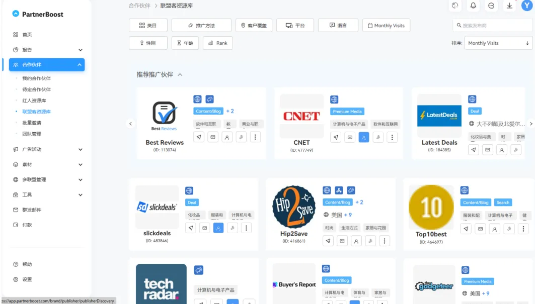 l筛选效率高:PartnerBoost有专业的陪跑团队,能协助商家对接资源。 以前手动找红人,一周也谈不下来5个。PartnerBoost可以通过详细的标签筛选出适推的红人或者联盟客,包括Slickdeals、Deals.Huaren这类折扣大站,以及Amobeez、Toppicks等测评媒体,平台都能协助建联,帮商家去匹配适推资源。