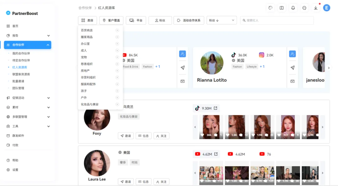 l资源量够大:后台显示有10万+联盟客与红人、20万+媒体资源,覆盖200多个国家。他所在的家居品类,系统直接匹配了300多个相关红人和50多家折扣/榜单媒体。