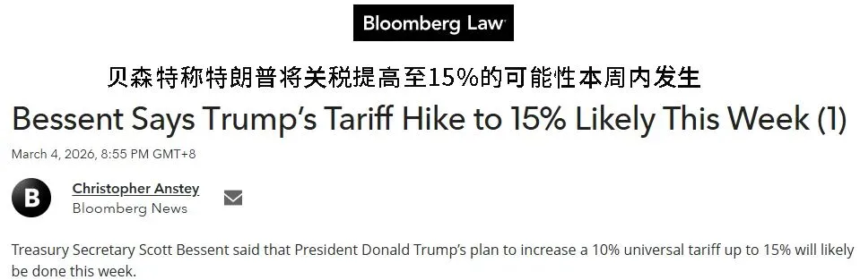 当地时间3月4日,美国财政部长贝森特在接受CNBC采访时公开表示,此前预告的全球输美商品关税从10%调高至15%的举措,预计将在本周内正式实施。
