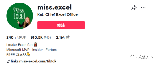 我们都知道,随着“汉语热”的升温,汉语的学习人群已经遍布世界。 而海外对知识产权的重视程度又非常高,他们已经习惯了提高付费的方式去获取知识,所以面对这些旺盛的需求,转化起来并不难。 更重要的是,在TikTok上做知识付费的边际成本几乎为0,一份课程就能无限次卖,没有物流问题,没有复杂的手续,不用建独立站就可以直接转化,项目门槛较低,适合更多想入局TikTok的朋友。 而对于已经有一定体系的商家朋友们,可以借鉴以下这个账号,这位博主想必大家或多或少都应该知道,是一位在Tiktok上分享Excel小技巧的博主,目前的粉丝数据快100万了,非常厉害。