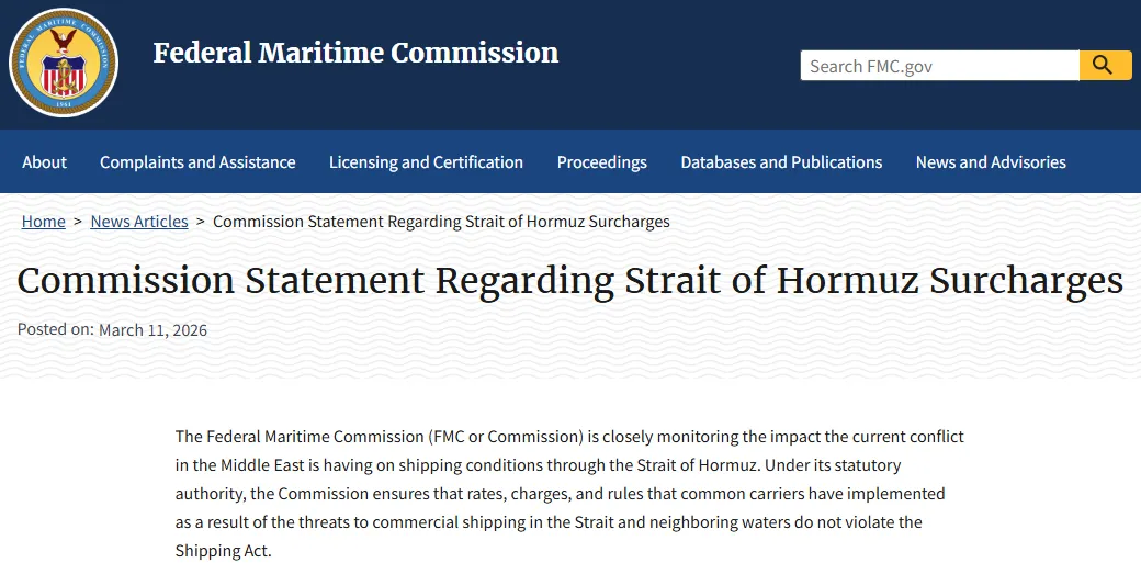 此前3月11日,FMC就已公开发表了一份《关于霍尔木兹海峡附加费的委员会声明》,明确表示正在严密监控中东局势对航运费用的影响。声明中特别提醒所有公共承运人,必须严格遵守《航运法》中关于运价本变动的公示要求。